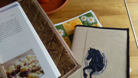 šité látkové obaly na knihy, mezi látky vložen vliselin, záložky ze stuhy. Možnost výběru motivu látky a velikosti